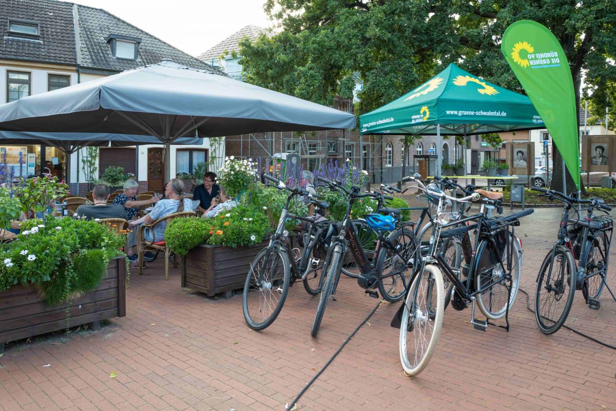 Wenn Grüne sich treffen, braucht man aber eigentlich gar keinen grünen Pavillon mit Sonnenblumen-Logo. Auch die vielen Fahrräder rund um den Treffpunkt sind ein Zeichen, das darauf hindeutet.