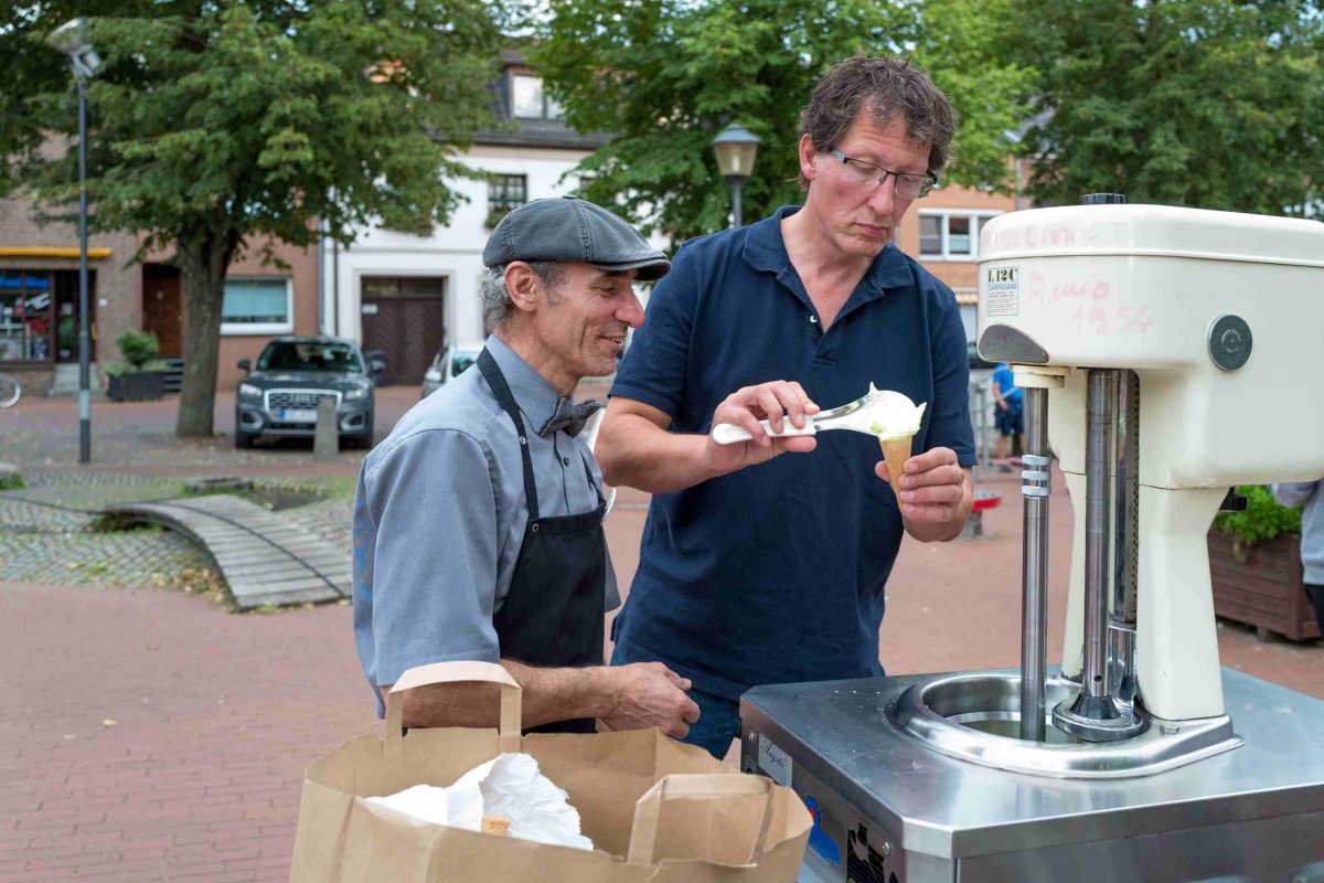 Erfreulicherweise war auch unser Eismann Pino wieder zur Stelle und spendierte allen Anwesenden sein legendäres grünes Eis. Unter den wachsamen Augen Pinos stellte Paul seine Vielseitigkeit unter Beweis und zeigte, dass er durchaus auch als Eismann Chancen hätte. 😉